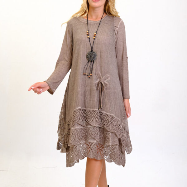 •Materialul prespălat conferă rochiei un aspect vintage distinctiv, aducând o notă de autenticitate și farmec. În plus, acest tip de material este cunoscut pentru că oferă un confort sporit și un aspect îmbătrânit elegant.
