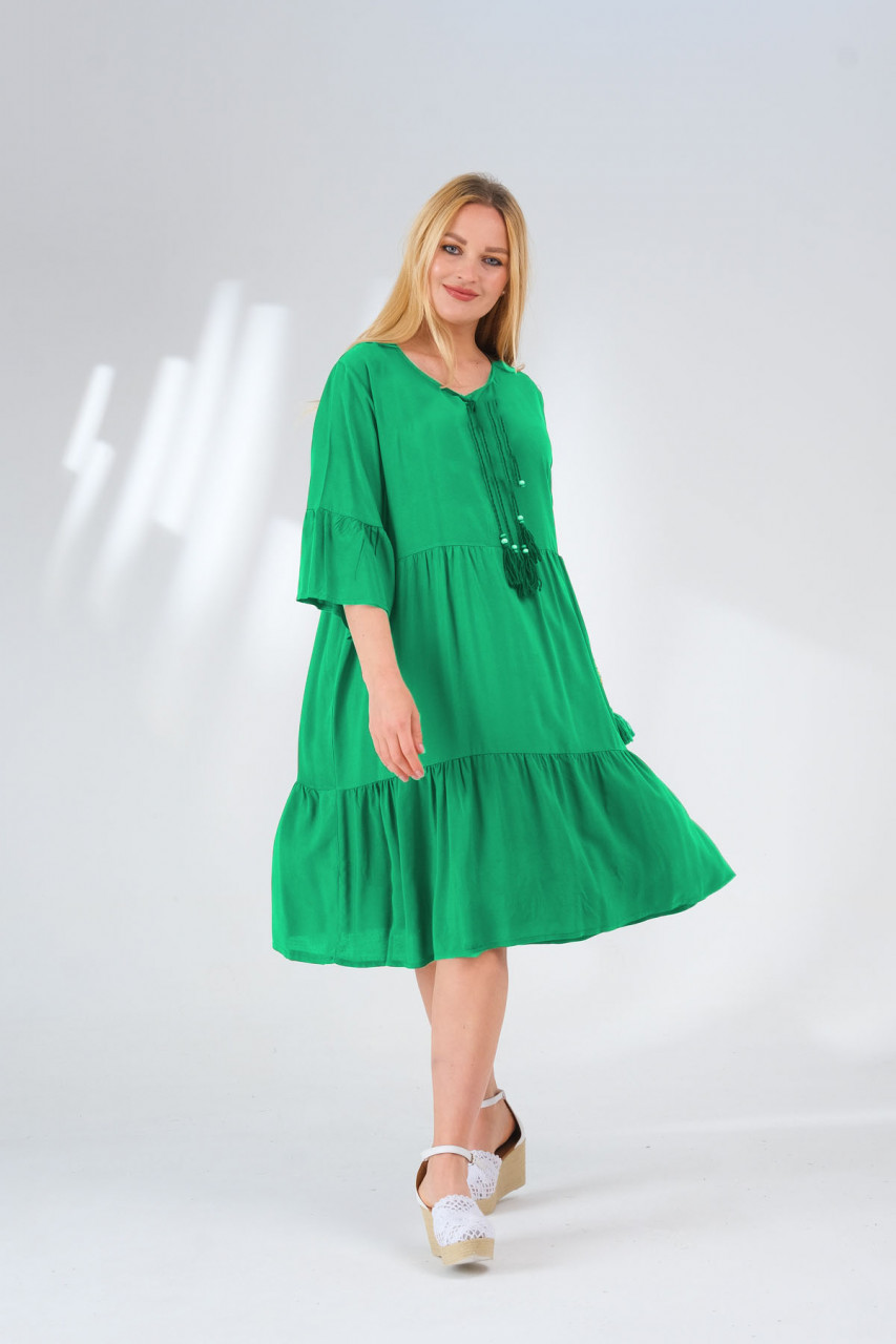 Este o piesă vestimentară care atrage privirile și aduce un zâmbet pe buzele celor din jur. Indiferent dacă o porți la o plimbare în parc sau la o cafea cu prietenii, această rochie cu mâneci trei sferturi, terminație cu volane și detalii de ciucuri ajustabile la gât este alegerea perfectă pentru a te simți frumoasă și încrezătoare în propriul tău stil.